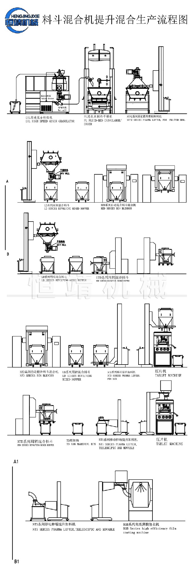 將配備好物料的周轉(zhuǎn)料斗推至與濕法制粒機機旁→向濕法制粒機中真空加料→經(jīng)過制?!鷿裾!稍铩锪咸嵘ǜ晌锪希┱!烧旰蟮念w粒落入周轉(zhuǎn)料桶→接料結(jié)束將周轉(zhuǎn)料桶推至總混合機提升加料至總混料筒→總混后的物料分料落入周轉(zhuǎn)料斗→將周轉(zhuǎn)料斗通過提升向壓片機(或膠囊充填機)加料→使用后的料斗推到清洗中心清洗。