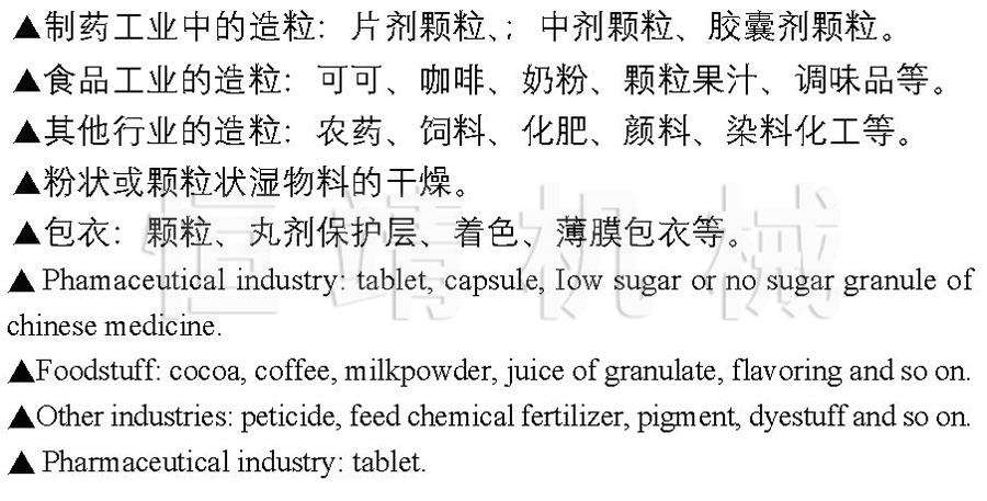 簡介:制藥工業(yè)中的造粒:片劑顆粒、中劑顆粒、膠囊劑顆粒 視頻工業(yè)的造粒:可可、咖啡、奶粉、顆粒果汁、調味品等 其他行業(yè)的造粒:農藥、飼料、化肥、顏料、燃料化工等