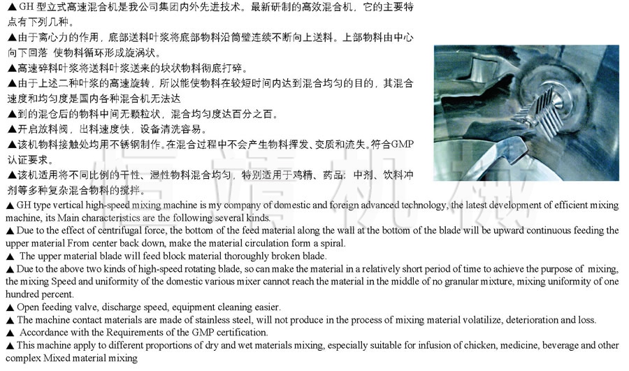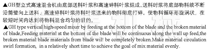 簡(jiǎn)介:GH型立式高速混合機(jī)由底部送料葉漿和高速碎料葉漿組成。送料時(shí)漿將底部物料續(xù)不斷沿筒璧向上送料,高速碎料葉漿將料葉漿送來的物料徹底打碎。使物料循環(huán)形旋渦狀,在較短時(shí)間內(nèi)達(dá)到將物料混合均勻的目的。