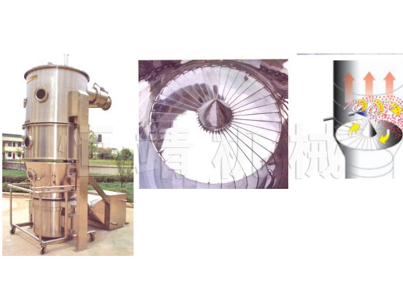 旋流流化床制粒包衣機(jī)是將流化床做成葉片式結(jié)構(gòu)的流化床,并使葉片呈一定斜度,讓氣流從葉片的間隙通過(guò),形成環(huán)流狀的強(qiáng)大氣流,使物料呈旋渦狀似的有序運(yùn)動(dòng),同時(shí)安裝在側(cè)壁的氣動(dòng)噴嘴將粘合劑或包衣液噴入呈旋渦狀的物料層,從而將粉體制成顆?;颢@得連續(xù)均勻的衣膜。