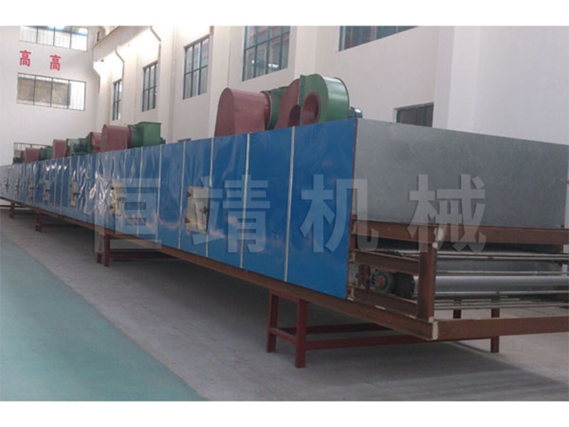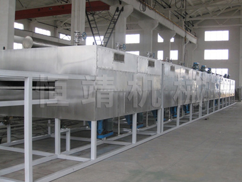物料由加料器均勻地鋪在網(wǎng)帶上,網(wǎng)帶一般采用12-60目不銹鋼絲網(wǎng),由傳動裝置拖動在干燥機內移動。干燥機由若干單元組成,每一單元熱風獨立循環(huán),部分尾氣由專門排濕風機排出,廢氣由調節(jié)閥控制,熱氣由下往上或由上往下穿過鋪滿物料的網(wǎng)帶完成熱量與質量傳遞的進程,帶走物料水份。網(wǎng)帶緩慢移動,運行速度可根據(jù)物料溫度自由調節(jié),干燥后的成品連續(xù)落入收料器中。上下循環(huán)單元根據(jù)用戶需要可靈活配備,單元數(shù)量亦可根據(jù)需要選取。