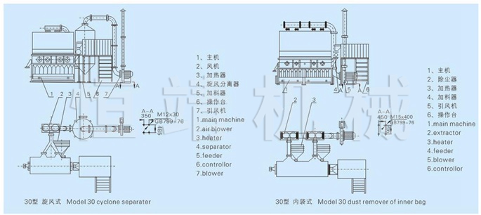 沸騰干燥,又稱流化床,它是由空氣過(guò)濾器、加熱器、沸騰床主機(jī)、旋風(fēng)分離器、布袋除塵器、高壓離心風(fēng)機(jī)、操作臺(tái)組成,由于干燥物料的性質(zhì)不同,配套除塵設(shè)備時(shí),可按需要考慮,可同時(shí)選擇旋風(fēng)分離器、布袋除塵器,也可選擇其中一種,一般來(lái)說(shuō)比重較大的如沖劑及顆粒物料干燥只需選擇旋風(fēng)分離器,比重較輕的小顆粒狀和粉狀物料需配套布袋除塵器,并備有氣力送料裝置及皮帶輸送機(jī)供選擇。